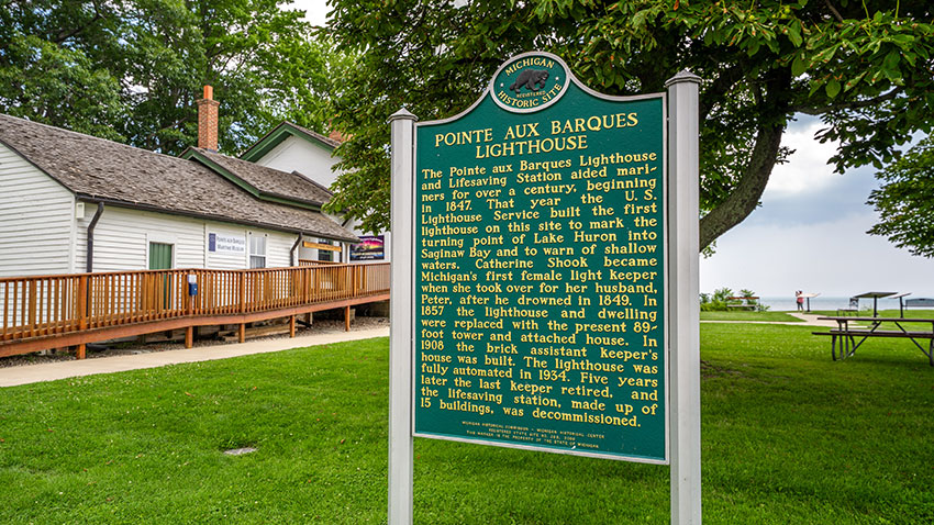 Now, as president of the Pointe aux Barques Maritime Museum, she is leading efforts to open the former life-saving station (active 1876 to 1937) as a museum, improve the existing museum in the former lighthouse keeper’s house and preserve the majestic lighthouse for posterity. These efforts have been supported by Michigan Lighthouse Assistance Program grants. Since 2000, the State Historic Preservation Office has awarded matching grants annually from the revenue generated by the sales of the Save Our Lights fundraising license plate. Grants were made to the Pointe aux Barques Lighthouse Society ($30,900 in 2004) and Huron County Road Commission ($16,000 in 2010 and $26,633 in 2014) to support restoration and preservation of structures at Pointe aux Barques.