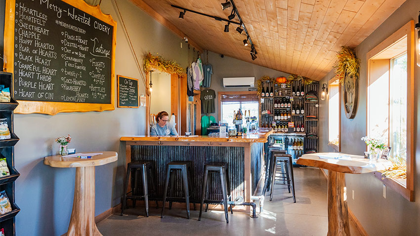 It was probably five years after we took over the orchard that we were looking for ways to expand business with the resources available. The seasonal nature of the orchard business wasn’t a sustainable income with our growing family. We found that there were years we had a lot of apples left over at the end of the season and making hard cider would be a great way to utilize those larger crops. Hard cider was an emerging market and becoming more popular, so we started learning and experimenting. Once we started understanding what great product we could produce, we started incorporating the other fruits we grow at the orchard to bring additional flavors of hard cider to our patrons. In 2016, we opened The Merry-Hearted Cidery on property with a small tasting room for those to sample hard cider and purchase bottles. This was a great way to supplement income in the months that the orchard was not open.